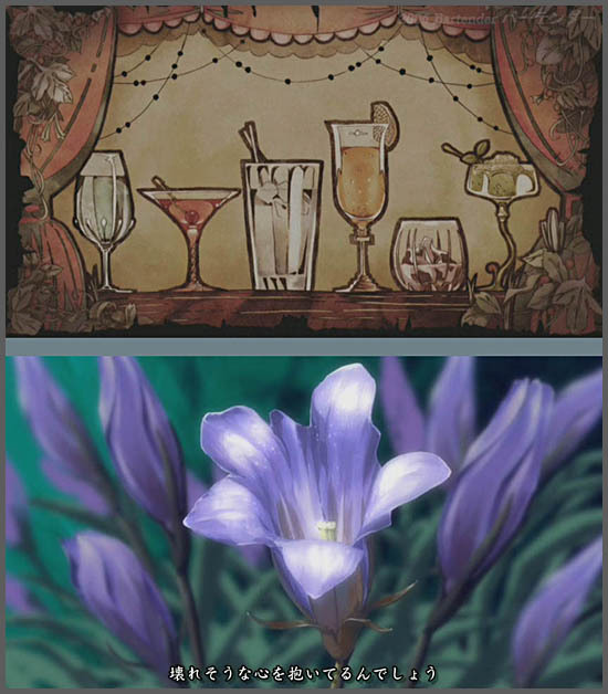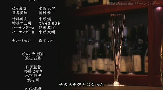 全11話還有特典。我收的是IFS字幕組DVDRIP,簡中MKV,畫質優but檔案大orz ![]() 紫色的花真美…(我想到《黑之契約者》片尾,那部我再也沒看完了Orz) 片頭曲「バーテンダー」 就是酒吧那種輕鬆的曲調XD 詞曲:大嶽香子/唄: ナチュラル ハイ (DefSTAR RECORDS) feat.椎名純平 ![]() 片頭曲結束後的開場白,背景很壯觀就照下來了XD 我雖然不喝酒,但是很喜歡酒瓶。 ![]() Suze Gimlet 女主角(?)最喜歡的。字幕出現時間很短,註解又好多,我有點驚到orz ![]() 本篇被洗腦(!?)的男人,神嶋。大學出去酒吧有不好的經驗,導致目前在飯店當部長要重建酒吧固執又嚴苛。那個不好的經驗,說白話點就是對於高級場所的羨慕與好奇,事先不做好功課,進去才發現消費水準之高,心裏有鬼認為有人在看,愛面子越點越貴,最後發現鈔票掉了... (囧)。 ![]() 之後不用想也知道被天才調酒師佐佐倉溜感動。佐佐倉用最平凡的加水威士忌(啊爆點了?)請這位剛教訓過三個調酒師的主管,神嶋部長初見這種看似小氣的酒暴怒不已,喝下去卻是說不出的爽口(?),然後如夢初醒般頓悟的回家啦。佐佐倉不只很會調酒,對於心理學也頗擅長嘛。 我最無法理解的是佐佐倉為何要刻意打碎冰雕,去冰箱拿冰塊不就得了? ![]() 美和負責開場與結束。(所謂的主持人?) 我對把頭髮梳成這樣的人沒有很喜歡orz 雖然知道這是表示乾乾淨淨的禮貌orz ![]() 職業笑容啊XDD 片尾介紹如何調出片中出現的彩虹調酒「Grass Hopper 綠色蚱蜢」 我想到《紅茶王子》每篇末也都有介紹紅茶的泡法或是甜點的作法~ ![]() 片尾曲是真實MTV ![]() 配音員: 佐佐倉溜 - 水島大宙 來島美和 - 藤村步 (其他人下一話再也不會出現就不用管了。) ![]() 片尾曲「始まりのヒト」起始之人 詞曲:大嶽香子/唄: ナチュラル ハイ (DefSTAR RECORDS) (和片頭曲一樣) ![]() 原來是現場調「綠色蚱蜢」的影片,了不起。 而且我偷瞄了一下第2話,是現場調「尼古拉斯」~這部決定全收啦XD!!! ![]() 原作 : 城アラキ 漫画 : 長友健篩 (集英社スーパージャンプ ) ナレーション (解說):森本レオ 監督: 渡辺正樹 系列構成、脚本: 今川泰宏 (那個破天荒遊戲動畫版的也是他,莫非去找原作看會...!?) キャラクターデザイン: 木下裕孝 色彩設計 : 村上智美 美術監督 : 池田繁美 撮影監督 : 松田範雄 音響監督 : 本山 哲 音楽 : 大嶽香子(ナチュラル ハイ,雙女子創作團體) 動畫制作 : パルムスタジオ 官方網站:http://www.bartender-tv.com/ |