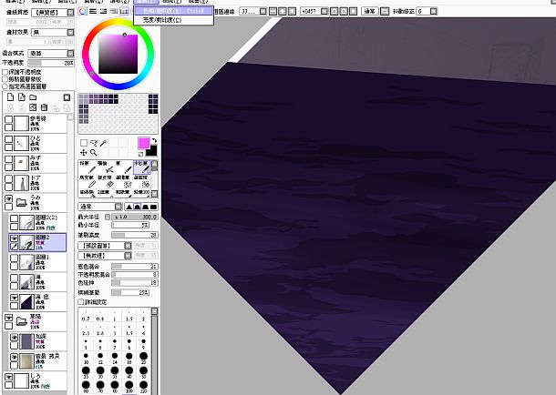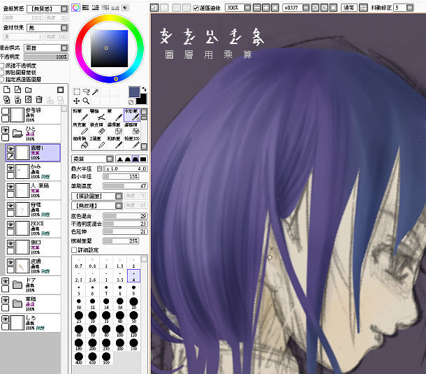 圖層用乘算,或畫筆用乘算。水彩筆調細、方筆頭,拉出幼線條