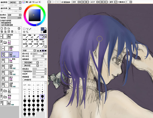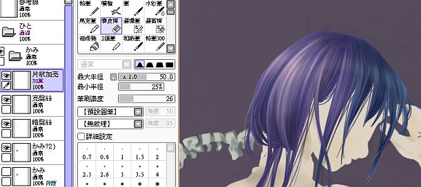 最細的髮絲用鉛筆會比較快,再新增圖層,隨意撇上最亮的區域表面,OK。