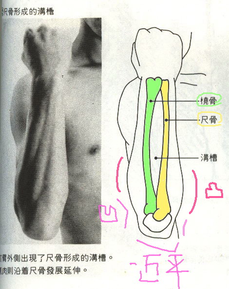 伸直時,手臂中間會有 ﹚ ﹙ 這種內凹的形狀
