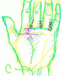 1~3:手指之間有縫。A:大拇指比其他指低一節左右。C:手腕有筋。