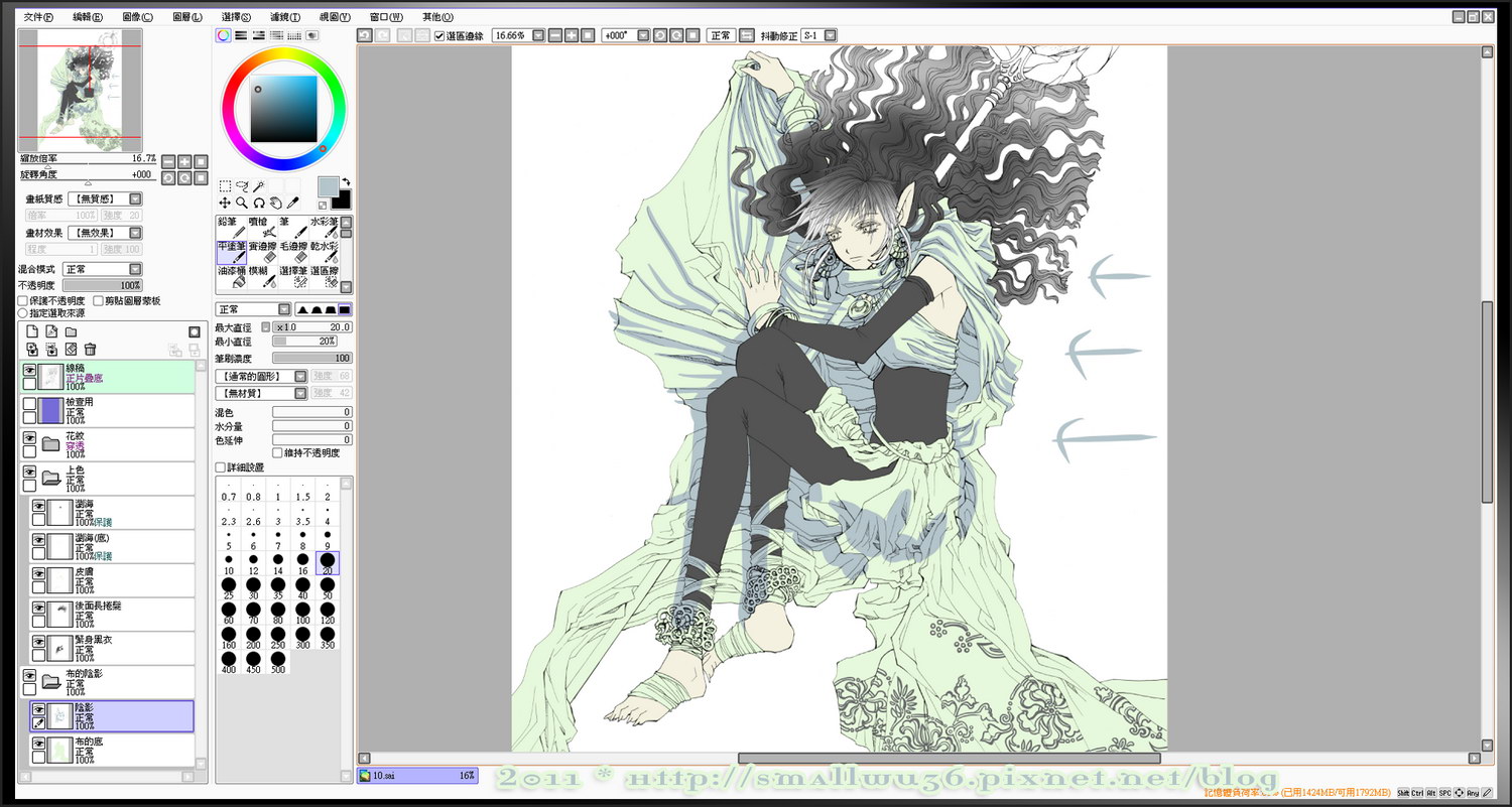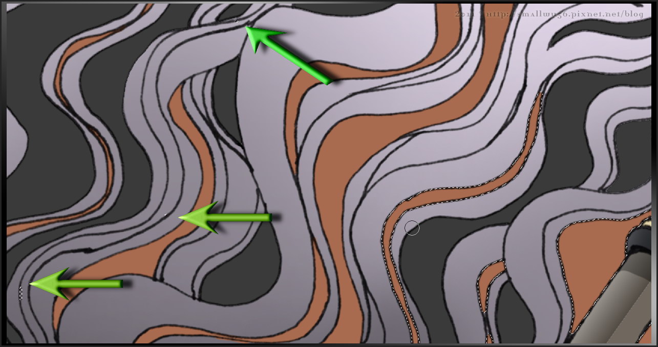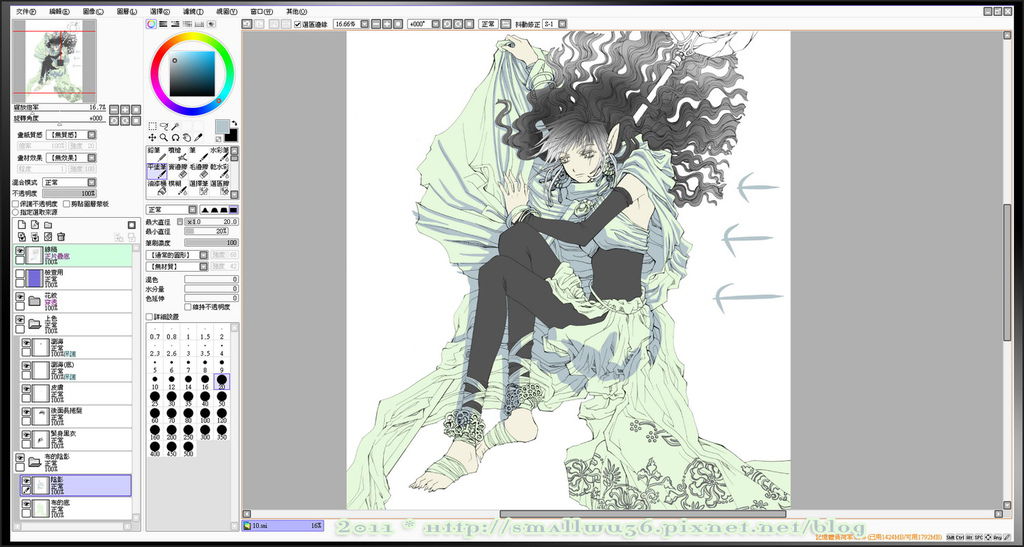 抓陰影位置。若沒有光源箭頭,我常會塗到錯亂orz SAI防手抖除了描線稿,塗塊狀也很方便順暢。