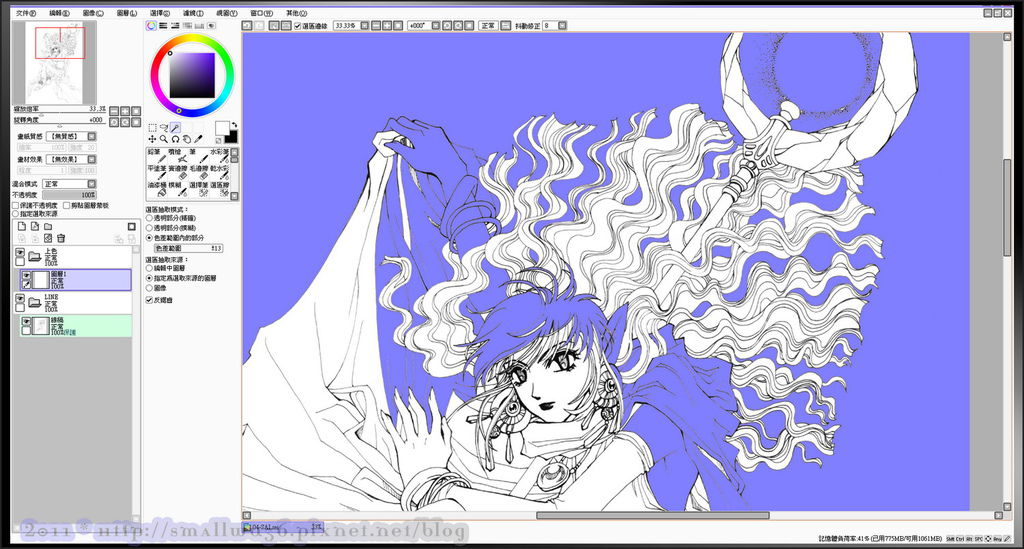 這時候就要大推SAI選取的功能了!! 可以指定選取圖層,選取處還有藍色遮罩預覽,重點是不小心手誤可以復原啊~(PS一手誤之前選的全炸光...)