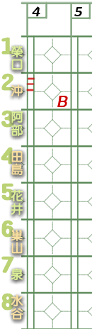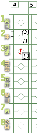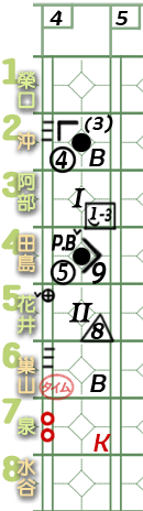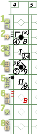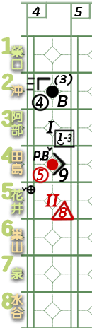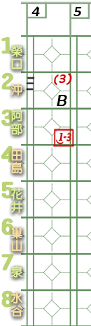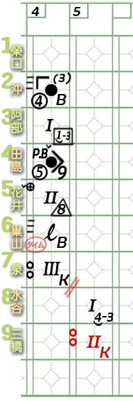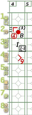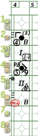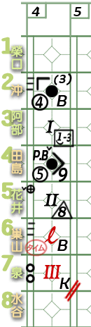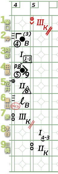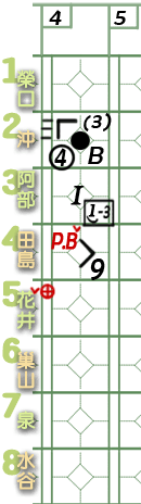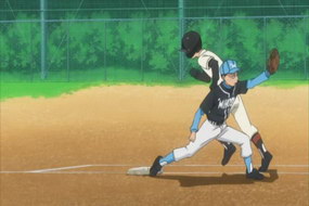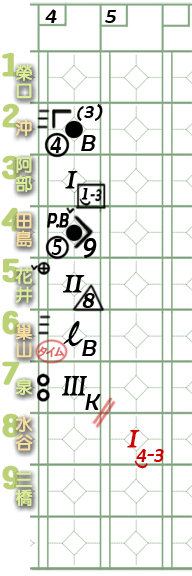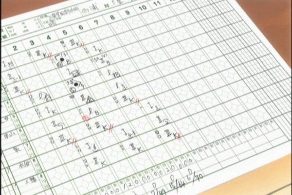 6棒巢山。 ![]() 謎版:「葉的臉色變了。好了,投手開始混亂了!」 ![]() 謎版:「連續4壞球!」 總之,6棒巢山獲4壞球保送1壘。 紀錄表: 6棒球數區:省略最後1球,故為壞球符號「-」3條。 壘格區:1壘格:4壞球上壘符號「B」。 |