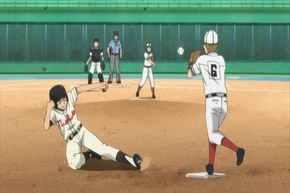 1棒泉 第一球就出手,犧牲觸擊成功(原本泉看到百監指示自己觸擊還有點不滿XD 看看榮口從Vol.1開始就多安分執行團隊戰術XD 不過那是因為美丞在防泉外野安打~) 1出局, 2、3壘有人。(跑者:水谷、3橋)