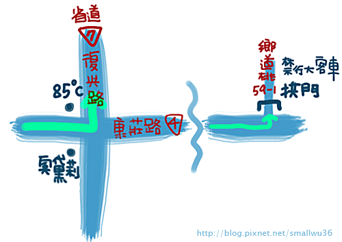 沿著康莊路(省道4號)到85度C與奧黛莉的十字路口要左轉才會到省道7號(復興路),