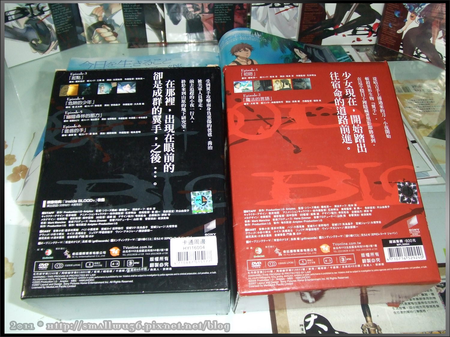 | 背面真的是寫動畫集數簡介~紅色盒子為Episode 1~2,黑色的為Episode 3~6。P.I.G、Aniplex原作(2005)。設計協力寺田克也和企劃協力押井守...都是聽過名字不過不熟的人物@@ |