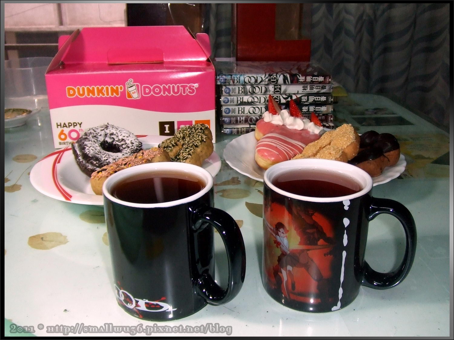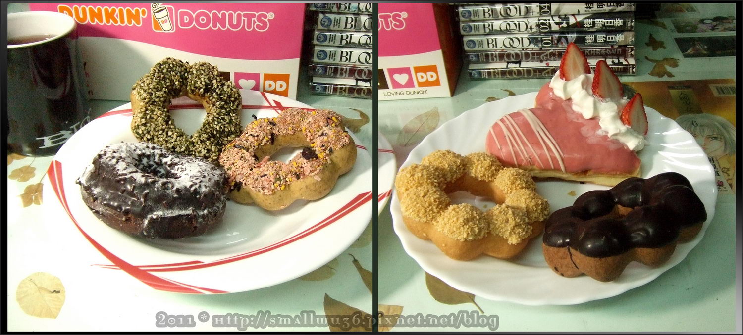 | 而喝飲料就要配點心XD 左上方是DUNKIN' DONUTS 新口味:海苔芝麻和櫻花海苔摩堤圈;左下是Triple巧克力棉甜甜圈。右上方是季節限定草莓Love巧心貝+鮮奶油草莓(那1.5顆草莓就比原價多10元XD)(話說草莓LOVE不是桶川恭太郎的筆名嗎XD (from《王樣老師》Vol.2))。右下方是金皇摩堤圈和Double巧克力摩堤圈。(味道就像Mister Donut 波提那樣QQ的~) |